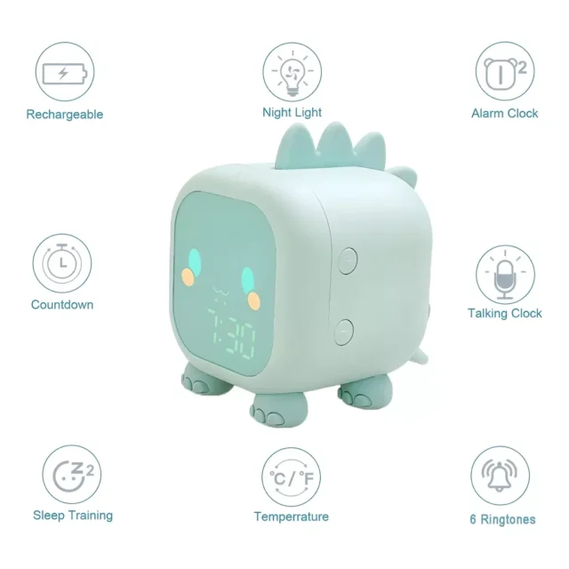 Introducing the perfect morning companion for your little one – our Dinosaur-Themed Kids’ Alarm Clock! This delightful and functional bedside accessory is designed to make waking up a fun and engaging experience for children. With its cute dinosaur shape and vibrant colors, it’s not just an alarm clock but a cheerful addition to any child’s bedroom.