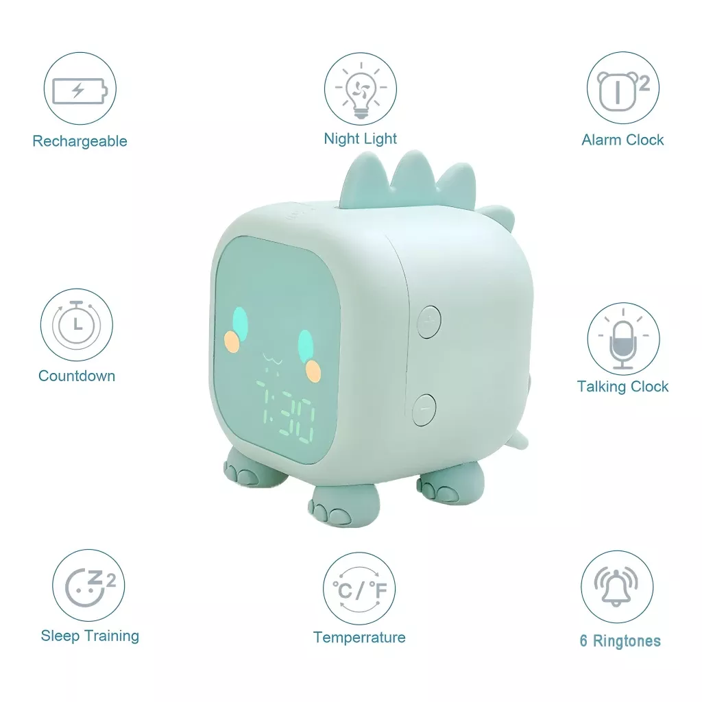 this dinosaur alarm clock is amazing. my child adores the cute design and it has quickly become a favorite in their room. the voice control feature is easy to use and adds a fun element to setting the alarm. the night light is soothing and provides a nice, soft glow that helps my child feel safe at night. the alarm is effective but not too loud, waking my child gently. the clock is also very well-made and durable, so i know it will last a long time. it has made our mornings much smoother and more enjoyable. highly recommend this clock to other parents.